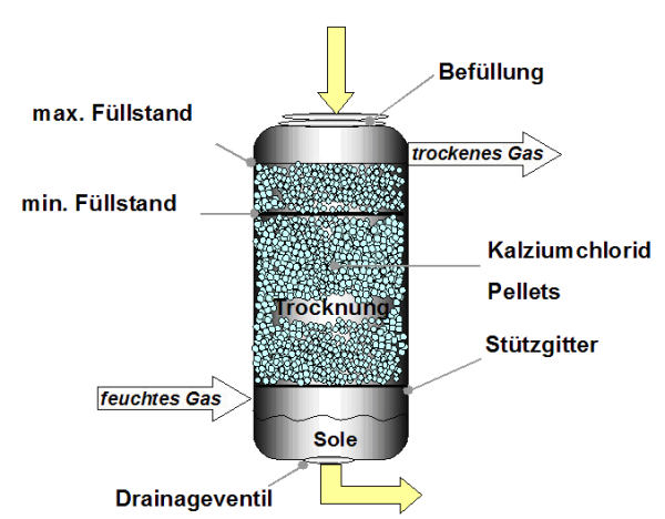 In der folgenden schematischen Darstellung ist ersichtlich, dass sich der Betriebsaufwand auf die Befüllung der Kolonne mit Kalziumchloridpellets reduziert. Es ist ein Betrieb auf zwei Kolonnen oder über ein periodisches System möglich. Die befeuchteten Pellets verflüssigen sich und laufen als Sole am Boden der Kolonne ab.