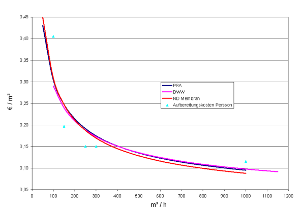 Das Bild zeigt den degressiven Verlauf der spezifischen Kosten der Methananreicherung in Abhängigkeit von der Anlagenkapazität. Die Ausgelichkurven der kosten haben Hyperbelform und liegen für alle drei dargestellten Verfahren in etwa gleich auf. Sie sinken von rund 0,3 Euro pro Kubikmeter bei einer Anlagenkapazität von 100 Kubikmeter pro Stunde auf 0,15 Euro pro Kubikmeter bei 400 Kubikmeter pro Stunde und rund 0,1 Euro pro Kubikmeter bei Anlagen mit 1000 Kubikmeter pro Stunde. [Tretter 2003]