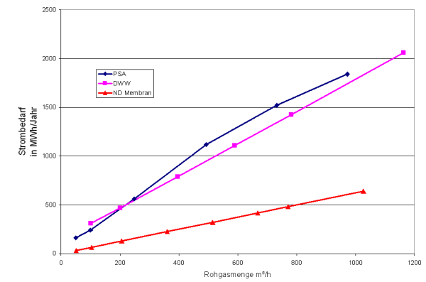 Das Bild zeigt den jährlichen Strombedarf der drei Aufbereitungstechnologien: Er steigt in etwa linear mit dem Rohgasdurchsatz. Bei 200 Kubikmeter Stundendurchsatz beträgt er für PSA und DWW rund 500 Megawattstunden, für 1.000 Kubikmeter pro Stunde steigt er auf etwa 1.800 Megawattstunden bei. Beim Membranverfahren liegt er jeweils etwa bei einem Drittel dieser Mengen. [Tretter 2003]