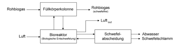 Das Bild zeigt das Fließschema eines Biowäschers: Ein Biowäscher besteht aus zwei separaten Kolonnen. Das Biogas durchströmt im Gegenstrom eine Füllkörperkolonne in der das H2S absorbiert wird. Das Absorptionsmedium wird in einem zweiten Bioreaktor regeneriert und teilweise als Abwasser abgeführt werden. Der Schwefel abgeschieden und liegt in Form von Schwefelschlamm vor. [IE 2005]