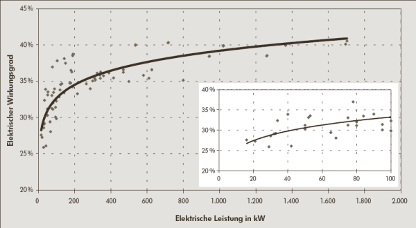 Das Bild zeigt die Abhängigkeit der elektrischen Wirkungsgrade von biogasbetriebenen Blockheizkraftwerken von der elektrischen Leistung. Die Trendlinie zeigt einen Anstieg von etwa 30 % Wirkungsgrad bei einer BHKW-Nennleistung von 40 Kilowatt über 33 % bei 100 Kilowatt auf etwa 35 % bei 250 Kilowatt und 37 % bei 500 Kilowatt. BHKW mit 1.200 Kilowatt bringen es bereits auf Wirkungsgrade von 40 % und darüber. [ASUE]