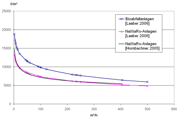 In der nachfolgenden Abbildung sind die Kostenkurven von Biogasanlagen dargestellt. Es handelt sich dabei um Investitionskosten von in Österreich realisierten Anlagen. Es wurde dabei zwischen Anlagen mit NaWaRo und Abfallentsorgungsanlagen unterschieden. [Laaber 2006/2]