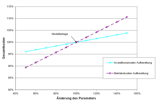 In der folgenden Abbildung sind die Gesamtkosten in Abhängigkeit von den Investitionskosten und den Betriebskosten für die Aufbereitung dargestellt. Die beschriebene Modellanlage ist mit den 100 % der Gesamtkosten dargestellt.