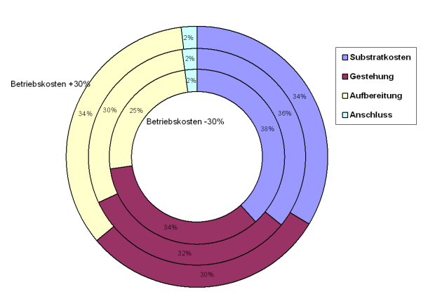 Das Diagramm zeigt die Veränderung der Kostenzusammensetzung bei unterschiedlichen Betriebskosten der biogasaufbereitung: Ausgehend vom Modellfall, bei dem die Kosten für die Gasaufbereitung 30 % der Gesamtkosten ausmachen (Substratkosten: 36 %, Erzeugung: 32 %, Anschluss: 2 %) sinkt ihr Anteil bei einer Verbilligung um 30 % auf 25 % der Gesamtkosten (Substrat: 38 %, Erzeugung: 34 %, Anschluss: 2 %). Steigen die Betriebskosten um 30 % steigt ihr Kostenanteil der Gaserzeugung auf 34 % (Substrat: 34 %, Erzeugung: 30 %, Anschluss: 2 %).