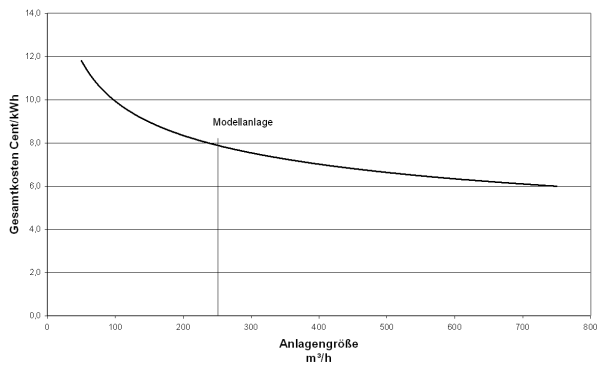 Die Größe (Kapazität) der Biogas-Anlage hat wesentlichen Einfluss auf die Gesamtkosten, wie die folgende Abbildung zeigt: Die Kurve zeigt einen starken Anstieg der spezifischen Gesamtkosten bei kleineren Anlagen und eine Kostenreduktion bei größeren Anlagen. Bei einer Anlage mit einer Produktionskapazität von 750 Nm³/h ergeben sich Gestehungskosten von ca. 6,2 Cent/kWh, bei einer Anlagenkapazität von 150 Nm³/h ergeben sich Kosten von 8,8 Cent/kWh. Für die Modellanlage ergeben sich spezifische Gesamtkosten von 7,8 Cent/kWh.
