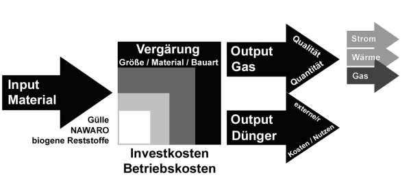 Das zeigt eine schematische Darstellung der Kostenblöcke der Biogaserzeugung: Ein wesentlicher Block sind die Kosten für das Input-Material (z. B. Gülle, NaWaRo, oder biogene Reststoffe). Die Investitions- und Betriebskosten der Anlage hängen wesentlich von der Größe und Bauart der Anlage sowie von den eingesetzten Materialien ab. Erlöse werden durch die Outputs erzielt, je nach Verwertung durch Gas, Strom und/oder Wärme und werden wesentlich von deren Qualität und Quantität bestimmt. Der Output „Dünger“ weist jedenfalls externe Kosten/nutzen auf, eventuell können damit auch erlöse lukriert werden.