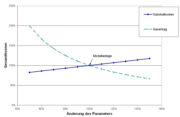 Das Diagramm zeigt die Sensitivität der Biogasgestehungskosten der Modellanlage in Abhängigkeit der Kosten für das Substrat und dem Gasertrag: Eine Änderung der Substratkosten um 50% wirkt sich in einer Änderung der Gestehungskosten um 20 % aus. Mit dem Gasertrag besteht eine reziproke Abhängigkeit der Gesamtkosten: Ein Steigerung des Gasertrags um 50 % würde eine Kostenabsenkung um etwa 30 % bewirken, würde der Ertrag um 50 % sinken verdoppeln sich die Gesamtkosten.